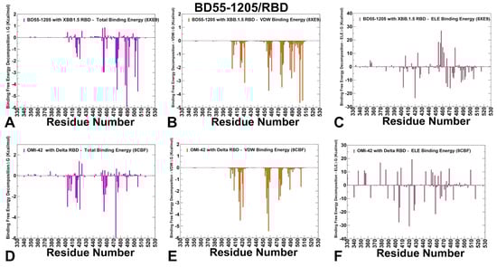The residue-based decomposition of the binding MM-GBSA energies for BD55-1205 and OMI-42 binding. The residue-based decomposition for BD55-1205/RBD binding shows the total binding energy (A), van der Walls contribution to the total MM-GBSA binding energy (B) and the electrostatic contribution to the total binding free energy (C). MM-GBSA contributions are evaluated using 1000 samples from the simulations of BD55-1205 complex with RBD, pdb id 8XE9. The residue-based decomposition for OMI-42/RBD binding shows the total binding energy (D), van der Walls contribution to the total MM-GBSA binding energy (E) and the electrostatic contribution to the total binding free energy (F). MM-GBSA contributions are evaluated using 1000 samples from simulations of OMI-42 complex, pdb id 8CBF. Residue-based binding free energy values are shown for total energies as magenta-colored filled bars, van der Waals contributions as orange-colored bars and electrostatic contributions as light-brown colored bars.