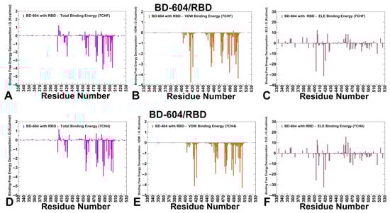 The residue-based decomposition of the binding MM-GBSA energies for BD-604 binding. The residue-based decomposition for BD-604/RBD binding shows the total binding energy (A), van der Walls contribution to the total MM-GBSA binding energy (B) and the electrostatic contribution to the total binding free energy (C). MM-GBSA contributions are evaluated using 1000 samples from the simulations of BD-604 complex with RBD, pdb id 7CHF. The residue-based decomposition for BD-604/RBD binding shows the total binding energy (D), van der Walls contribution to the total MM-GBSA binding energy (E) and the electrostatic contribution to the total binding free energy (F). MM-GBSA contributions are evaluated using 1000 samples from simulations of OMI-42 complex, pdb id 7CH4. Residue-based binding free energy values are shown for total energies as magenta-colored filled bars, van der Waals contributions as orange-colored bars and electrostatic contributions as light-brown colored bars.