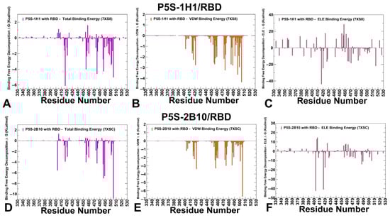 The residue-based decomposition of the binding MM-GBSA energies for P5S-1H1 and P5S-2B10 binding. The residue-based decomposition for P5S-1H1/RBD binding shows the total binding energy (A), van der Walls contribution to the total MM-GBSA binding energy (B) and the electrostatic contribution to the total binding free energy (C). MM-GBSA contributions are evaluated using 1000 samples from the simulations of P5S-1H1 complex with RBD, pdb id 7XS8. The residue-based decomposition for P5S-2B10/RBD binding shows the total binding energy (D), van der Walls contribution to the total MM-GBSA binding energy (E) and the electrostatic contribution to the total binding free energy (F). MM-GBSA contributions are evaluated using 1000 samples from simulations of P5S-2B10 complex, pdb id 7XSC. Residue-based binding free energy values are shown for total energies as magenta-colored filled bars, van der Waals contributions as orange-colored bars and electrostatic contributions as light-brown colored bars.