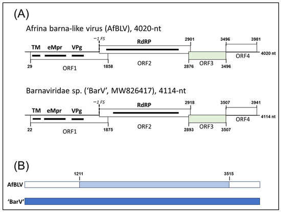 High-throughput sequencing of each of the nine field samples of A. sporoboliae produced between 50 and 84 million paired-end raw reads, and, after removal of reads mapped to the nematode genome (between 78.39 and 89.76%), allowed to assemble de novo between 22,846 and 30,048 contigs over 500 nt in length (Table 1). Initial bioinformatics analysis revealed the presence of a single, ca. 4.0 kb virus-related contig in sample A1 encoding four open reading frames (ORFs) (Figure 1A). Given the number of ORFs, their organization, and presence of characteristic conserved domains with visible similarity to barna- and barna-like sequences (see below), it was assumed that the identified contig represented complete or nearly complete genome of a new barna-like virus from A. sporoboliae and it was named Afrina barna-like virus (AfBLV). To exclude the possibility of AfBLV originating from S. cryptandrus or contaminating fungal organisms, the reads were mapped against fungal and plant databases retrieved from the NCBI. The number of reads mapped against fungal genomes varied between 0.0015% and 0.0060%, depending on an individual sample, significantly lower than the number of reads mapped to the AfBLV genome (Table 1), excluding the fungal origin of AfBLV. The number of reads mapped against a Sporobolus maritimus plant genome (GCA_965119375.1) varied between 0.0395% and 0.0921%, depending on an individual sample, and was significantly lower than the number of reads mapped to the AfBLV genome (Table 1), excluding the plant origin of AfBLV.