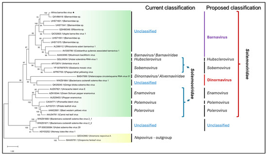 Figure 2. Maximum likelihood phylogenetic consensus tree based on the predicted amino acid sequence of the RdRP depicting the genetic association of AfBLV (PV941960) to other species in the order Sobelivirales. ICTV accepted families are highlighted in colored boxes as follows. Green: virus species belonging to the approved families Solemoviridae, Barnaviridae, and Alvernaviridae. Yellow: outgroup sequences of anemone nepovirus A (QED42866.1) and grapevine fanleaf virus (BAA00761.1) from the family Secoviridae were used for phylogenetic tree construction. Bootstrap values are represented at each node. Two panels to the right of the tree present the positions of the analyzed virus RdRP sequences in a current classification of genera from the Solemoviridae, Barnaviridae, and Alvernaviridae families, proposing amendments to this classification. Genera and families comprising virus species currently approved by ICTV are italicized; new genera Barnavirus (purple) and Dinornavirus (red) are highlighted in bold. Clades and lineages not classified in the current or proposed classifications are designated as “unclassified”.