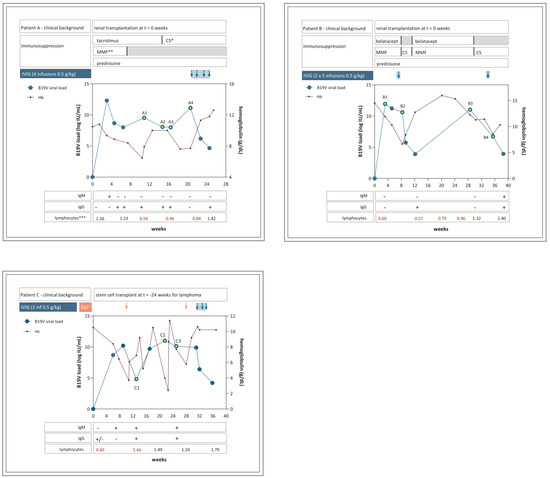 In the period 2011–2019, three patients were identified with relapsing B19V infection. The clinical background; course of viremia; hemoglobulin levels; and immune parameters, including the presence of antibodies and lymphocyte counts, are shown in Figure 1. Patients A and B received a kidney transplant at t = 0 weeks, at which time both patients tested negative for B19V viremia. Patient C received stem cell transplantation (SCT) for Non-Hodgkin lymphoma (NHL) 5 months previously, and t = 0 represents the latest time-point before B19V viremia. During most of the sampling period, patients A and B were lymphopenic due to immunosuppressive treatment. While stable donor chimerism was initially achieved after SCT in patient C, lymphocyte function can be considered progressively impaired due to underlying progressive Non-Hodgkin lymphoma (NHL) after SCT from t = 0 onwards. This patient received donor lymphocyte infusions (DLIs) as part of NHL treatment during the sample period. Patient A and B were B19V-seronegative before transplantation. Patient C was B19V-seropositive before transplantation, but the SCT donor was B19V-seronegative. Patient A first became IgM-positive, then IgG-positive, from 3 weeks after transplantation, but IgG reversion occurred between 20 and 24 weeks after transplantation. Patient B became IgG-positive after IVIG treatment at 12 weeks after transplantation. Patient C first became IgM-positive, then IgG-positive, from t = 7 weeks.
