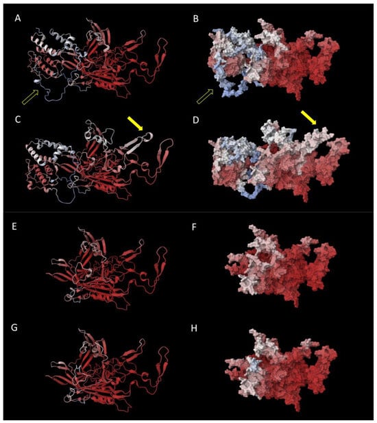 Protein structural modeling of the mutated VP1 (A–D) and VP2 (E–H) AA sequence from patient A. (A) Baseline protein structure and (B) surface representation of VP1, as modeled from the AA sequence for time point A1, baseline (cartoon representation), open arrow indicates VP1u region (for a view of the entire VP1u region, see Supplementary Figure S1); (C) protein structure and (D) surface representation of VP1, as modeled from the AA sequence with T372S substitution (time point A2), resulting in an additional loop marked by the closed yellow arrow. (E) Baseline protein structure and (F) surface presentation of VP2, as modeled from the AA sequence for time point A1 (cartoon representation); (G) protein structure and (H) surface presentation of VP2, as modeled from the AA sequence with T372S substitution (time point A2), not resulting in structural changes. The heat colors indicate pLDDT values (see Methods Section); red indicates high values. AlphaFold 2 was used to generate the models here, with an analogous analysis using AlphaFold 3 generating similar changes in the 3D structure, which are included in Supplemental PowerPoint S1.