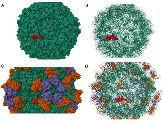 VP1 variable region associated with the studied variant projected onto known capsid 3D structures. In (A,B), the variable region in red is projected to the structure of the B19V capsid in green (PDB-ID 1S58). (C,D) show the projection of the variable region in red to the B19V capsid (PDB-ID 6NN3) in green decorated with Fab molecules from a human antibody; heavy chain in orange and light chain in purple. Only one variable region of VP1 in the capsid structure is highlighted.