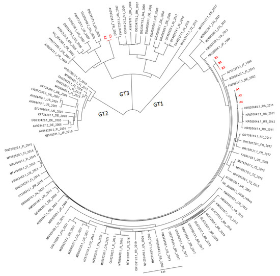Phylogenetic analysis of patients A and B sequences and global B19V GenBank strains. Selected Genbank strains > 4800 bp of genotype 1, 2, and 3. GenBank strains are denoted by GenBank entries, followed by country (2-digit code according to ISO-3166-1 alpha 2 country codes) and year of isolation.