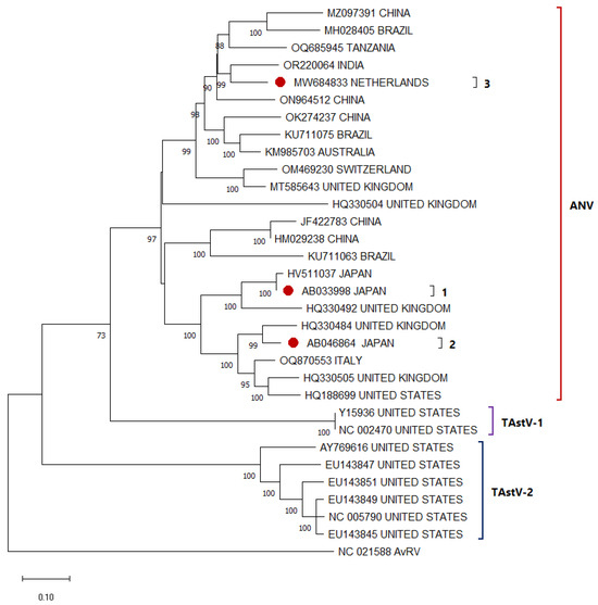 Phylogenetic relationships between AAstV nucleotide sequences (all reported sequences of TAstV-1 and 2 were included, and some sequences from every location were randomly selected) infecting turkeys (ANV in red bracket, TAstV-1 in purple bracket, TAstV-2 in blue bracket) based on ORF2 sequences previously deposited in the GenBANK distributed by the countries in which they were reported. The sequences were aligned using the CLUSTAL OMEGA method in Geneious Prime v2.0.10. (https://www.geneious.com) (accessed on 13 July 2025) software. The phylogenetic tree was constructed using the MEGA 11 software package using the maximum likelihood statistic method and the Tamura-Nei substitution model. The numbers along the branches refer to bootstrap values for 1000 replicates. The scale bar represents the number of substitutions per site. Reference sequences for ANV-1 to 3 were marked with a red circle. A sequence of AvRV (NC_021588) was used as an outgroup.