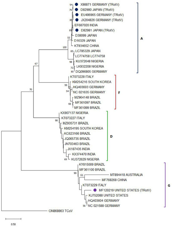 Phylogenetic relationships between AvRV nucleotide sequences (some sequences from every location were selected randomly), including sequences isolated in infected turkeys (type A in blue, F in red, D in green, and G in purple), based on VP6 sequences previously deposited in the GenBANK distributed by the countries in which they were reported. The sequences were aligned using the CLUSTAL OMEGA method in Geneious Prime v2.0.10 (https://www.geneious.com) (accessed on 13 July 2025). The phylogenetic tree was constructed using the MEGA 11 software package using the maximum likelihood statistic method and the Tamura-Nei substitution model. The numbers along the branches refer to bootstrap values for 1000 replicates. The scale bar represents the number of substitutions per site. TRotV sequences were marked with a circle. A sequence of TCoV (ON868863) was used as an outgroup.