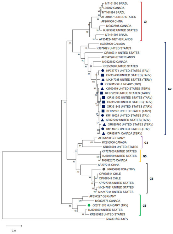 Phylogenetic relationships between ARV nucleotide sequences (some sequences from every location were selected randomly), including sequences isolated in infected turkeys (G1 in red, G2 in blue, G3 in green, G4 in purple, G5 in yellow and G6 in gray) based on Cσ gene sequences previously deposited in the GenBANK distributed by the countries in which they were reported. The sequences were aligned using the CLUSTAL OMEGA method in ClustalX2 2.1. The phylogenetic tree was constructed using the MEGA 11 software package using the maximum likelihood statistic method and the Tamura-Nei substitution model. The numbers along the branches refer to bootstrap values for 1000 replicates. The scale bar represents the number of substitutions per site. TRV sequences reported in cases of arthritis or tendosivitis (TARV) were marked with a square. TRV sequences reported in cases of enteritis or liver disease (TERV) were marked with a triangle. TRV sequences reported in cases sharing both symptomologies were marked with a circle. A sequence of ChPV (MW331553) was used as an outgroup.