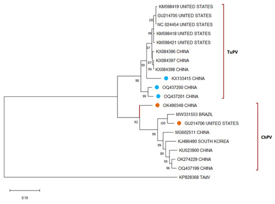 Phylogenetic relationships between APV nucleotide sequences (some sequences from every location were selected randomly), including sequences isolated in infected turkeys (TuPV in light blue and ChPV) based on VP1 sequences previously deposited in the GenBANK distributed by the countries in which they were reported. The sequences were aligned using the CLUSTAL OMEGA method in ClustalX2 2.1. The phylogenetic tree was constructed using the MEGA 11 software package using the maximum likelihood statistic method and the Tamura-Nei substitution model. The numbers along the branches refer to bootstrap values for 1000 replicates. The scale bar represents the number of substitutions per site. The ChPV sequences grouped in the TuPV sequence clade are marked with a light blue circle. TuPV sequences clustered in the ChPV sequence clade are marked with an orange circle. A sequence of TAdV (KP828368) was used as an outgroup.
