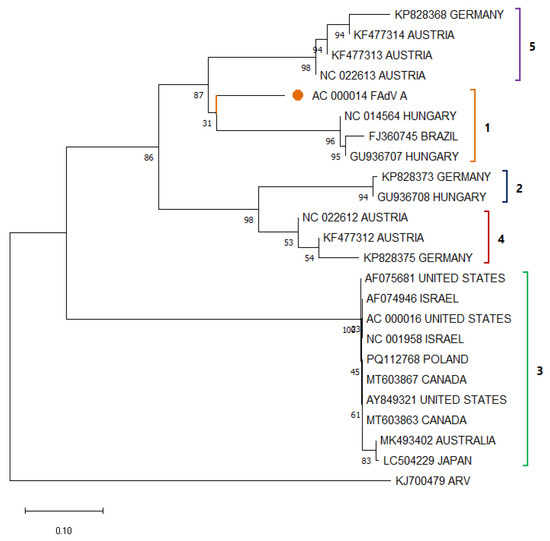 Phylogenetic relationships between FAdV nucleotide sequences (some sequences from every location were selected randomly), including sequences isolated in infected turkeys (TAdV-1 in orange, TAdV-2 in blue, TAdV-3 in green, TAdV-4 in red, and TAdV-5 in purple) based on Hexon sequences previously deposited in the GenBANK distributed by the countries in which they were reported. The sequences were aligned using the CLUSTAL OMEGA method in ClustalX2 2.1. The phylogenetic tree was constructed using the MEGA 11 software package using the maximum likelihood statistic method and the Tamura-Nei substitution model. The numbers along the branches refer to bootstrap values for 1000 replicates. The scale bar represents the number of substitutions per site. One FAdV-A sequence was included and circled in orange. A sequence of ARV (KJ700479) was used as an outgroup.