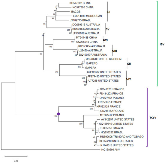 Phylogenetic relationships between AvCoV nucleotide sequences (some sequences from every location were randomly selected), including sequences isolated in infected turkeys (IBV in green and TCoV in purple), based on S1 sequences previously deposited in the GenBANK distributed by the countries in which they were reported. The sequences were aligned using the CLUSTAL OMEGA method in ClustalX2 2.1. The phylogenetic tree was constructed using the MEGA 11 software package using the maximum likelihood statistic method and the Tamura-Nei substitution model. The numbers along the branches refer to bootstrap values for 1000 replicates. The scale bar represents the number of substitutions per site. The TCoV clade is marked with a purple circle. A sequence of ANV (HQ188699) was used as an outgroup.