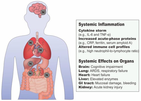 SARS-CoV-2 infection also triggers body-wide systemic inflammation, which can damage tissues and organs if not controlled. The influence of the N protein on systemic inflammation is illustrated in Figure 2. A drastic cytokine storm, characterized by considerably increased IL-6, IL-8, IL-10, TNF-α, and IFN levels in COVID-19 patients, leads to systemic inflammatory immune responses [76]. N protein induces the production of tumor necrosis factor receptor 2 (TNFR2), CCL4, IL-1β, IL-6, IL-6R, IL-10, and IL-12 in human monocytes [77]. Notably, N protein treatment results in the escalation of IL-6 mRNA expression, which might be attributable to the increased levels of NF-κB pathway markers like NF-κB subunit 1 (NFKB1) and NF-κB inhibitor alpha (NFKBIA) [77]. The LLPS of N protein also activates NF-κB and further facilitates robust secretion of IL-6, IL-1β, TNF-α, and CXCL10 [54]. While inflammasome activation does not directly drive the cytokine storm, it triggers the release of IL-1β, which, in turn, induces the production of IL-6 and IL-8 [78]. Mechanistically, pathogenic T helper type 1 (Th1) cells and CD14+CD16+ monocytes trigger proinflammatory signaling, leading to macrophage and neutrophil infiltration and a subsequent cytokine storm in the lungs [79]. IL-6 is a key cytokine in the COVID-19 cytokine storm and serves as an independent predictor of lung injury severity [80]. Its signaling has been linked to coagulopathy and hepatic endotheliopathy in COVID-19 pneumonia, contributing to the progression of liver injury [81].