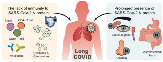 Long COVID, or post-acute sequelae of SARS-CoV-2 infection (PASC), refers to a broad spectrum of new symptoms continuing for weeks or months after SARS-CoV-2 infection. The sequelae include cardiac arrhythmias, chronic respiratory failure, neuropsychiatric symptoms, and gastrointestinal symptoms [109,110]. Long COVID may be linked with ineffective clearance and prolonged immune activation by the adaptive immune system. Absence of increased immunity against the N protein, combined with its potent pro-inflammatory effect to stimulate cytokine and chemokine pathways, presumably contributes to the pathogenesis of long COVID (Figure 3) [111].