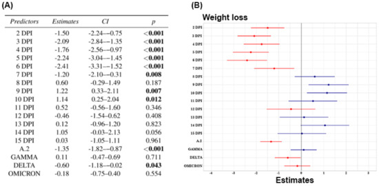 Comparative analysis of body weight loss in hamsters inoculated with four different SARS-CoV-2 variants. (A) Analysis of weight loss per day postinoculation and between variants. (B) Beta values obtained after applying GLM to the mean weight loss values of the animals, days postinoculation and the four different SARS-CoV-2 variants. The animals were individually recorded. The red lines represent the potential contribution to weight loss, and the blue lines represent the potential contribution to weight gain. p < 0.05 was considered statistically significant.