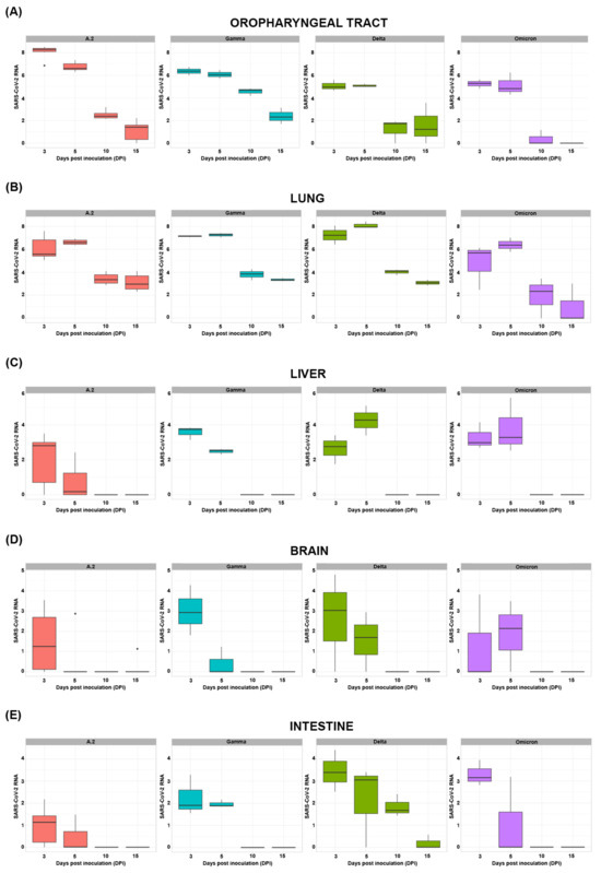 Oropharyngeal tract and tissue samples were collected during the euthanasia. Each variant presented different SARS-CoV-2 RNA contents throughout the course of infection, as depicted in Figure 2.