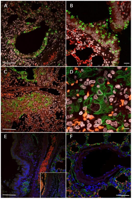 Photomicrographs of the immunofluorescence assay. (A) SARS-CoV-2 nucleocapsid in green, showing immunoreactivity for the viral antigen in bronchial cells in marked quantity. Host cell nuclei in blue (DAPI) and erythrocytes in red (Evan’s blue stain). Scale bar = 50 µm. (B) In green, SARS-CoV-2 antigens remain in desquamated bronchial cells after evident epithelial hyperplasia. Host cell nuclei in white (DAPI) and erythrocytes in red (Evan’s blue stain). Scale bar = 20 µm. (C) Immunolabelling for pan-cytokeratin showing epithelial hyperplasia with atypia (in green). These cells exhibit erratic growth, promoting loss of the usual tissue architecture. Host cell nuclei in white (DAPI) and erythrocytes in red (Evan’s blue stain). Scale bar = 50 µm. (D) Immunolabelling for pan-cytokeratin in green, indicating epithelial hyperplasia with atypia. Cellular pleomorphism, anisocytosis, anisokaryosis, evident nucleoli. Host cell nuclei in white (DAPI) and erythrocytes in red (Evan’s blue stain). Scale bar = 10 µm. (E) Green podoplanin-positive cells. The lymphatic vessel at the top shows variable amounts of intraluminal leukocytes (magnified picture) and a cluster of type I pneumocytes at the bottom. Host cell nuclei in blue (DAPI) and erythrocytes in red (Evan’s blue stain). Scale bar = 50 µm. (F) Lymphatic vessels positive for anti-podoplanin (in green) localised around bronchial arteries. Host cell nuclei in blue (DAPI) and erythrocytes in red (Evan’s blue stain). Scale bar = 50 µm.