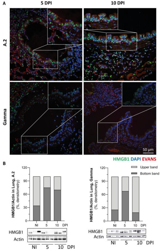 To demonstrate the role of the innate immune response in SARS-CoV-2-induced lung injury, HMGB1 translocation was assessed. As shown in Figure 4, immunofluorescence staining revealed the presence of HMGB1, mainly in pneumocyte type 2 cells, with a few cells showing cytoplasmic HMGB1 staining for both the A.2 and Gamma variants at 5 and 10 DPI (Figure 4A, insets). We investigated whether infection could lead to different redox forms of HMGB1. The alarmin HMGB1 is susceptible to intracellular redox modifications, resulting in an all-thiol form, a disulfide form (Cys23-Cys45 intramolecular disulfide bond with the Cys106 thiol form), or a fully oxidised form. Under normal conditions, HMGB1 inside the nucleus is fully reduced, as previously reported [34]. In the injured lungs of the animals infected with both the A.2 and Gamma variants (compared with noninfected animals (NI) which showed a predominant upper band, light grey), Western blot analysis revealed the appearance of a lower band (dark grey bar). The appearance of the lower band suggested the formation of the disulfide form of HMGB1 (dsHMGB1). Our qualitative data suggest that the presence of dsHMGB1 is increased at 5 DPI by the Gamma variant. However, for A.2 variant infection, it seems that the dsHMGB1 form persisted abundantly until 10 DPI (Figure 4B).