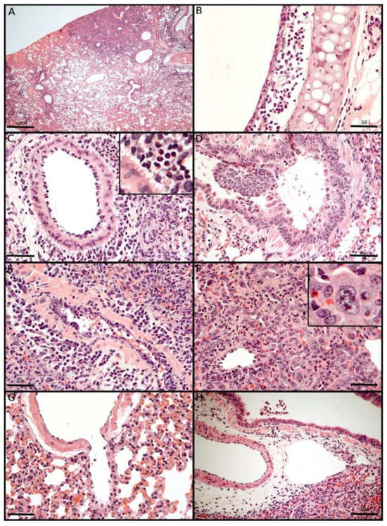 For all variants that exhibited SARS-CoV-2-induced inflammatory lung injury in the inoculated hamsters 72 h after intranasal inoculation, the earliest microscopic aspect of the lung injury observed was segmental interstitial pneumonia with strong mononuclear inflammation, alveolar oedema, and a random distribution of hepatized areas throughout the lung, without any lung-side predominance. For comprehensive microscopic analysis, we explored respiratory SARS-CoV-2-induced injury in the airway, alveolar, and vascular compartments. At 3 to 5 DPI, the animals presented with epithelial congestion, epithelial upper airway and bronchial desquamation with cilia loss due to subepithelial mononuclear infiltration with rupture of the lamina propria (Figure 5B,D) and submucosa layers and the presence of megakaryocytes and eosinophils (highlighted in Figure 5C), with haemorrhagic areas. The detached epithelial cells were often associated with the formation of epithelial plugs in the deep bronchial lumen and with alveolar collapse (Figure 5D).