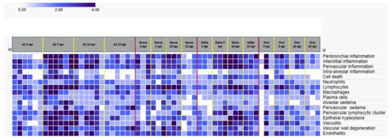 Histopathological changes in the lungs of hamsters infected with SARS-CoV-2, according to semiquantitative analysis by score and represented on the heatmap. The animals were grouped by variants (A.2, Gamma, Delta and Omicron), and within these variants, they were organised into subgroups of days postinfection. The heatmap analyses were carried out using the Morpheus online tool (https://software.broadinstitute.org/morpheus (accessed on 31 July 2024)). Each row represents a histopathological parameter used to apply the scores, and each column represents an animal. The hierarchy average linkage clustering method with Euclidean distance measurement was used. The highest score is represented in dark blue, and the lowest score is represented in light blue. White represents a score of zero for a given parameter.