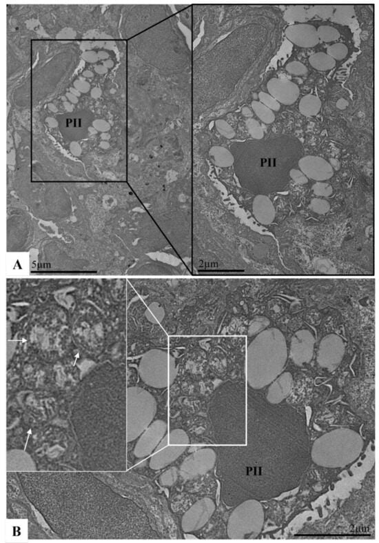 Lungs of Syrian hamster infected with SARS-CoV-2 (Delta AY.6 variant) at 10 DPI. (A,B) Note: type II pneumocyte hyperplasia (PII) and mitochondrial vacuolization and disorganisation of the mitochondrial crests (arrow). Transmission electron microscopy.