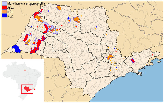 In Figure 1, we can also observe the geographic distribution of the samples from this study and from Genbank, used for the reconstruction of the phylogenetic tree, according to the resulting groups (genetic characterization) and antigenic variants/profiles (AgV-3, NC1, and NC2).