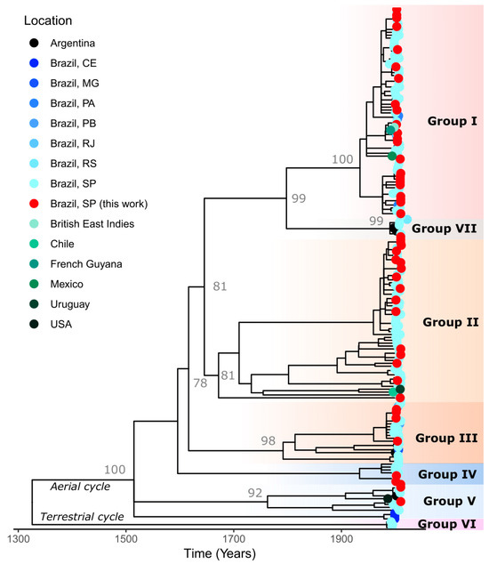 Time-scaled phylogenetic tree reconstructed using 320 nucleotides from nucleoprotein terminal gene using IQ-TREE software version 2.4.0, visualized and edited using FigTree software version 1.4.4 and plotted in RStudio version 2024.12.1+563 using ggtree version 3.14.0, treeio version 1.30.0, and igraph version 2.1.4 packages. The samples from this study can be observed in the tree in red dots; other samples from Brazil, available in GenBank, are marked in a blue pallet of colors while samples from other countries are marked in a green pallet of colors. The groups determined in this study are delineated vertically by red (Group I), orange (Groups II and III), and dark blue (Groups IV and V) shading. The groups without segregated samples from this study are shown with pink (Group VI) and gray (Group VII) shadings.