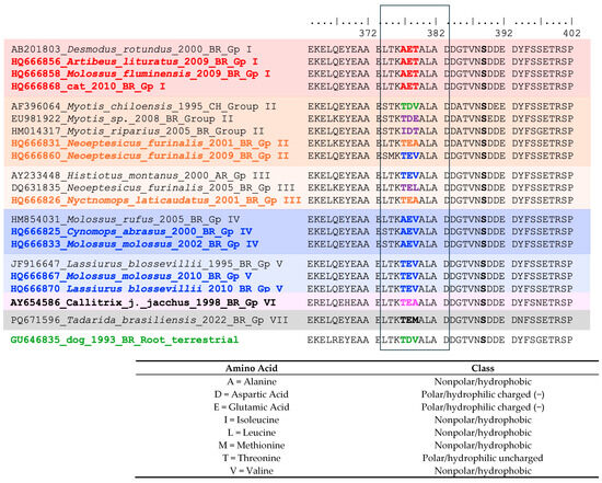 A partial amino-acid alignment showing the presence of antigenic site I in the nucleoprotein. The color match those in the phylogenetic tree presented in Figure 2. For this figure, the sequences used in the phylogenetic tree reconstruction were employed, maintaining only the variability in the antigenic site region, with a preference for sequences from this study. The genetic signature AET is shown in red (and also highlighted with red shading) for phylogenetic Group I related to hematophagous bat species D. rotundus; AEV is shown in dark blue (and also highlighted with dark blue shading) for phylogenetic Group IV related to non-hematophagous bats; TEV is shown in a gradient of dark blue (and also highlighted in a gradient dark blue shading) for phylogenetic Group V; TEA is shown in magenta/pink (and also highlighted with pink shading) for phylogenetic Group VI related to marmosets; TEM in black (and also highlighted with gray shading) for phylogenetic Group VII related to the bat species T. brasiliensis; TDV is shown in green for the root group related to the terrestrial cycle of transmission of RABV. For phylogenetic groups II and III (highlighted with gradient orange shading), it was not possible to find one genetic signature in the antigenic site I; in fact, in these groups, the variability was diverse and is noted in different colors: TEA in orange for the major antigenic site found (which was the same genetic signature found in Group VI related to marmosets), purple for variations (TEL, TDE, IDT), dark blue for the same signature present in Group V (TEV), and green for the same signature present in the terrestrial cycle of transmission (TDV) in one sequence available at GenBank (AF396064). The amino acid letters and class are outlined above.