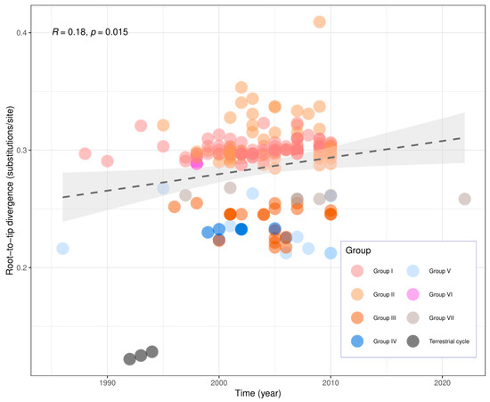 The Pearson correlation coefficient calculated in the analysis of temporal virus variability in this dataset was 0.18 (p = 0.015), as shown in Figure 4. Although the correlation coefficient is slightly positive, the TempEst analysis showed the stable evolution rate to the dataset during the sampling period considered in the analysis.