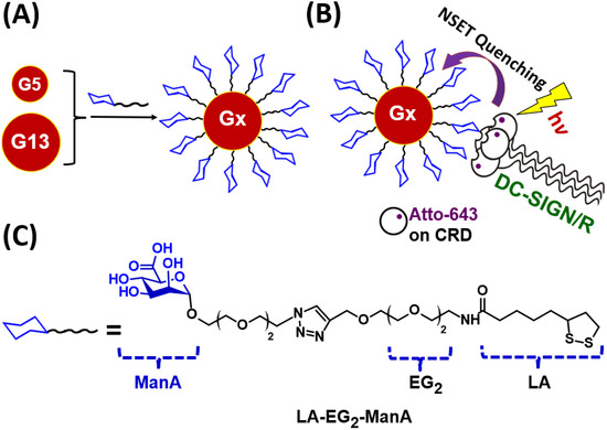 (A) A schematic representation of Gx-ManA synthesis. (B) A schematic showing the principle of the GNP-fluorescence quenching assay for MLGI. Upon binding with Gx-ManA, the Atto-643 labels on DC-SIGN/R CRDs are efficiently and completely quenched via a nano-surface energy transfer (NSET) mechanism [21]; thus, the quenching efficiency represents the proportion of DC-SIGN/R that has bound to Gx-ManA. (C) Schematic representation of the chemical structure of LA-EG2-ManA ligand used in this study.