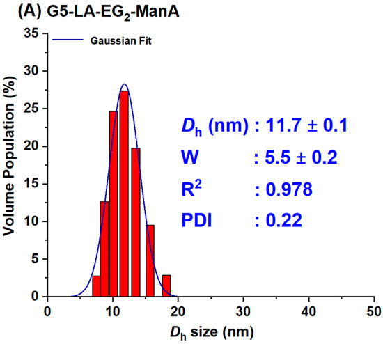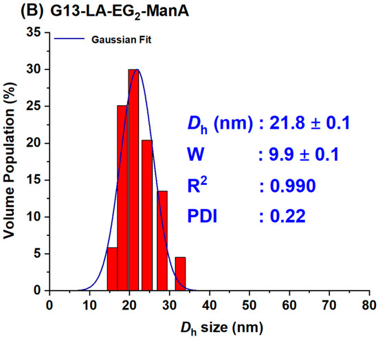 The Dh histograms (volume population) of the prepared G5-ManA (A) and G13-ManA (B) fitted a single Gaussian distribution function with fitting parameters inserted in each graph.