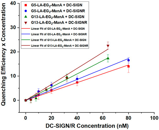 The (QE × C) versus C plots for Gx-ManA (x = 5 and 13) binding with DC-SIGN/R and their corresponding linear fits.