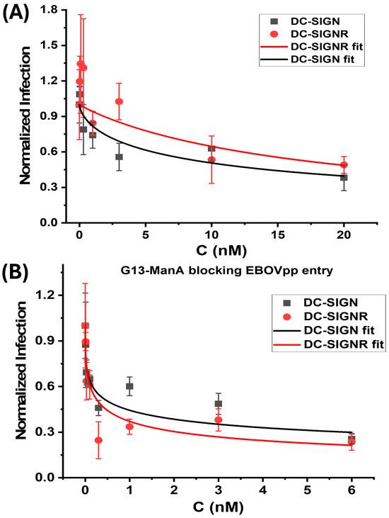 Gx-ManA blocking EBOVpp cellular infection. Plots of normalised luciferase activity (NA) against the Gx-ManA concentration for the 293T cells after treatment with varying doses of (A) G5-ManA and (B) G13-ManA as EBOVpp entry inhibitors. The data were fitted using Equation (5). The luciferase activities of all treatment samples were subtracted by their corresponding control backgrounds (SI, Figure S7) and then normalised by those obtained in the absence of Gx-ManA.