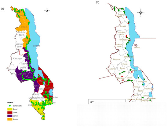 - Changadeya, W.; Ambali, A.J.D.; Kambewa, D. Farmers’ adoption potential of improved banana production techniques in Malawi. Int. J. Phys. Soc. Sci. 2012, 2, 32–48. [Google Scholar]