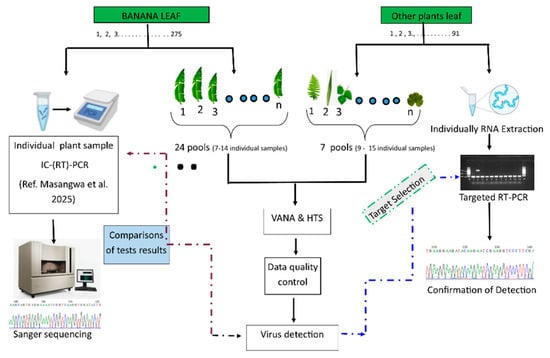 IC-(RT)-PCR-based tests were previously carried out on individual banana samples (Table S2) [3]. The tests detected eight viruses: BBTV, BanMMV, and six BSV species (i.e., BSOLV, BSCaV, BSMYV, BSIMV, BSGFV, and BSV-Lac).