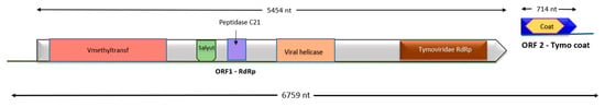 Genome organization of the novel virus of the family Tymoviridae. The long grey ORF represents ORF1 (RdRp in frame 1). Positions of the conserved sequence domains in the encoded proteins are indicated by colors: vmethyltransf (Pink color), Salyut (green color), Peptidase C21 (purple color), viral helicase (pale orange color), and the Tymoviridae RdRp (brown color). The ORF2 in dark blue color (coat protein in Frame 2) contains the Tymo-coat (yellow color) conserved domain.