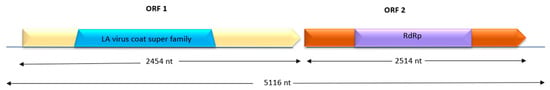 In addition, a contig presenting homologies with Totiviridae species was identified in pool J3–16. BLAST analyses showed the contig was most closely related to Pterostylis totivirus (OL471348) with 70% nt identity (28% query cover). After contig extension, the near complete genome was obtained (5116 nt length, NCBI Acc. # PQ682663). This virus has two ORFs: LA-virus coat and RdRp (Figure 4).