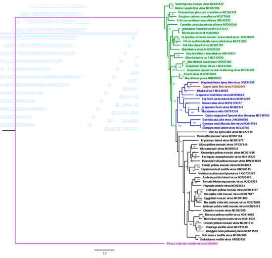 Maximum likelihood phylogenetic tree of nearly complete genomes of the new virus identified in this study with other viruses from the Tymoviridae family (green = marafiviruses; black = tymoviruses; blue = maculaviruses; and purple = root).