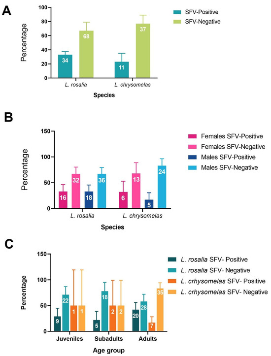 Prevalence of simian foamy virus (SFV) infection according to Leontopithecus species (A), sex (B), and age group (C).