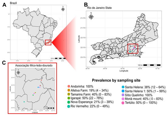 Geographic distribution of groups sampled in the state of Rio de Janeiro (RJ) (A), in the municipalities of Silva Jardim and Rio Bonito (B). In (C), we highlighted the municipalities where the collections were carried out, with Silva Jardim being the most representative (10 collection points) and Rio Bonito with only one point of data collection. Each color represents a different collection point. In the legend, we showed the SFV prevalence in each one of the collection points.