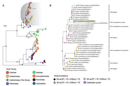 Phylogenetic tree inferred using maximum likelihood analysis with a fragment of SFV viral polymerase (213-bp). The new sequence generated in the current study is marked with a golden star. The host species within the Callitrichidae and the Cebidae families are listed. The node labels are colored according to the host family used in the dataset. Node labels are colored according to the SH-type approximate likelihood ratio test (SH-aLRT) and ultrafast bootstrap (UFBoot) supports. The node labels colored in black represent support for SH-aLRT and UFBoot equal to or greater than 75%. When only SH-aLRT is superior to the cutoff, the label is represented in gray, while only UFBoot node labels are represented by white squares. When both parameters are lower than 75%, no label is depicted. Purple rectangles represent the calibration points used to further explore the timescale of the phylogeny. In (A) we see the phylogeny of SFV infecting the five Primate families. (B) represents the phylogeny of SFV infecting Cebidae and Callitrichidae families.
