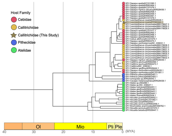 In terms of prevalence in AP, still little is known. It is estimated that the mean prevalence of SFV in captive AP ranges from 23 to 61% [8,11,14,19,20], and among the free-living AP, it ranges from 16 to 29% [8,9,20]. The scarce studies on natural SFV infections are a limiting factor in our understanding of the virus’ epidemiology [10]. Furthermore, although only a few complete and partial SFV genomes from AP are currently available in literature, phylogenetic analyses suggest that SFV generally follows a co-speciation model, as observed in Afro-Eurasian primates [7,9,11,20]. AP arrived in the Americas approximately 40 million years ago [21], diverging between 41.1–22.7 million years ago [21]. Due to the relatively recent speciation of AP and the ecological overlap among extant species—characterized by shared habitats—there is evidence of cross-species transmission events of SFV between AP species and genera [7,20,22,23].