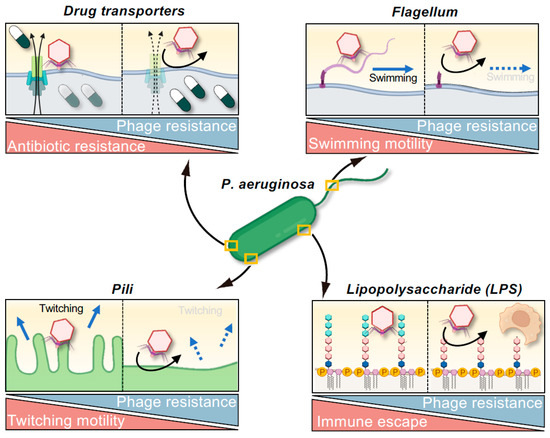 Evolutionary trade-offs associated with phage resistance in Pseudomonas aeruginosa. The acquisition of phage resistance can compromise bacterial traits such as antibiotic resistance, motility, and immune evasion. Resistance mechanisms that affect pili or flagella often impair bacterial twitching or swimming motility. Modifications to outer membrane structures, including LPS and drug transporters, can reduce the capacity for immune evasion or increase antibiotic susceptibility. These trade-offs offer therapeutic opportunities by attenuating virulence and reversing AMR, even when phage-resistant variants emerge.