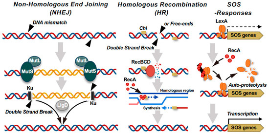 DNA double-strand break (DSB) repair pathways and SOS response activation in bacteria linked to phage resistance. Bacteria utilize multiple pathways to repair DSBs. The non-homologous end joining (NHEJ) pathway involves Ku and LigD, which directly ligate DNA ends, whereas MutS–MutL appears to suppress aberrant recombination. By contrast, homologous recombination (HR), which is initiated by the RecBCD complex, processes DNA ends and facilitates RecA-mediated strand invasion. Notably, RecBCD also functions as a defense factor by recognizing and degrading foreign linear DNA, such as DNA of injected phage genomes. RecA activation leads to LexA autocleavage, triggering the SOS response and inducing genes involved in DNA repair and damage tolerance.