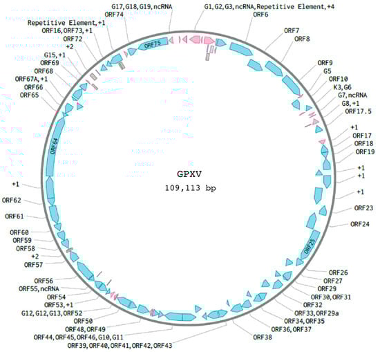 Schematic of GPXV genome. A 109.1 Kbp consensus genome was de novo assembled from Illumina NGS reads of DNA isolated from purified GPXV virions. The genomic structure of GPXV contains 24 GPXV-specific non-ORF features (pink). The GPXV genome encodes several potential ncRNAs (purple) and repetitive features (gray). Overlapping ORFs are labeled with “+1” or “+2” to indicate their reading frame relative to adjacent genes. These are independently predicted ORFs, not alternate transcripts or isoforms, and are included for completeness based on automated genome annotation pipelines.
