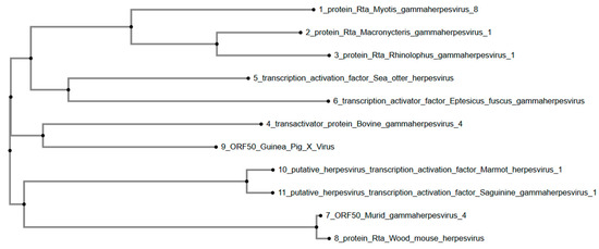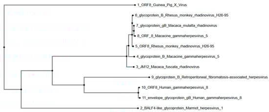 Protein sequences for ORFs 8, 9, 50, and 73 were extracted from the annotated genome (GenBank format) using Biopython (https://biopython.org/; version 1.84) and subjected to BLASTp (https://blast.ncbi.nlm.nih.gov/Blast.cgi; version 2.16.0) searches against the viral database in the Bacterial and Viral Bioinformatics Resource Center (https://www.bv-brc.org/app/Homology; accessed on 25 August 2024) and InterPro (https://www.ebi.ac.uk/interpro/; accessed on 1 September 2024) to identify homologous viral proteins. A minimum ORF size threshold of 300 bp was applied, corresponding to proteins of at least 100 amino acids. This threshold was chosen to balance sensitivity with the risk of false positives. Additional criteria for ORF identification included the presence of start and stop codons. To mitigate the risk of false positives from smaller ORFs, additional verification was conducted for sequences between 300 bp and 500 bp through manual curation and comparative analysis with closely related Herpesviridae genomes. The protein sequences, along with homologs from related viral genomes, were aligned using Clustal Omega (https://www.ebi.ac.uk/jdispatcher/msa/clustalo; accessed on 24 September 2024). Separate phylogenetic trees were first generated for each ORF alignment using MAFFT/Multiple Alignment using Fast Fourier Transform (https://mafft.cbrc.jp/alignment/server/index.html; accessed on 17 October 2024).