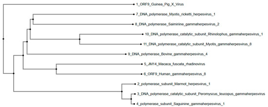 Similarly, the phylogenetic tree (Figure 3) constructed using the DNA polymerase catalytic subunit and homologous sequences indicates that GPXV ORF9 forms a distinct branch. It aligned distantly with sequences from Myotis ricketti herpesvirus 1, Saimiriine gammaherpesvirus 2, and Rhinolophus gammaherpesvirus 1. Bovine gammaherpesvirus 4 and Macaca fuscata rhadinovirus are positioned in an intermediate clade. Additionally, Marmot herpesvirus 1, Peromyscus leucopus gammaherpesvirus, and Saguinine gammaherpesvirus 1 form separate, branching clades. Human-associated Gammaherpesvirus 8 diverges from GPXV ORF9 within the same cluster but shows lower similarity.