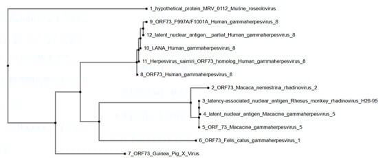 Lastly, a phylogenetic tree (Figure 5) was constructed using the ORF73 protein sequence from GPXV and homologous sequences from other members of the Gammaherpesvirinae subfamily. The phylogenetic tree shows that GPXV ORF73 forms a separate branch, away from other gammaherpesviruses included in the analysis. The human gammaherpesvirus 8 sequences, including ORF73 Human gammaherpesvirus 8, ORF73 F997A/F1001A Human gammaherpesvirus 8, latent nuclear antigen partial Human gammaherpesvirus 8, LANA Human gammaherpesvirus 8, and Herpesvirus saimiri ORF73 homolog Human gammaherpesvirus 8, cluster together, indicating their close relationship. The primate gammaherpesviruses, including ORF73 Macaca nemestrina rhadinovirus 2, latency-associated nuclear antigen Rhesus monkey rhadinovirus H26-95, latent nuclear antigen Macacine gammaherpesvirus 5, and ORF73 Macacine gammaherpesvirus 5, form a distinct clade. Felis catus gammaherpesvirus 1 ORF73 is positioned within the primate gammaherpesvirus clade. Murine roseolovirus hypothetical protein MRV_0112 is placed as an outgroup, showing the greatest evolutionary distance from the other viruses in the tree.