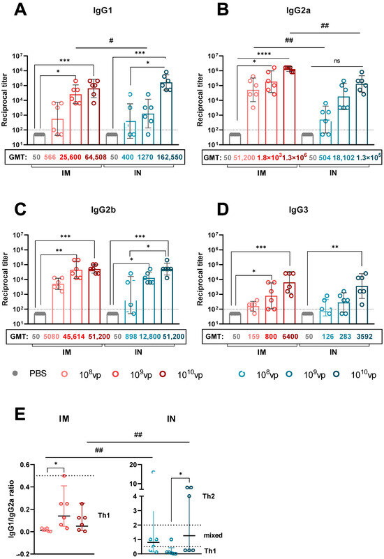 3.4. Route of rSAd25-H1 Administration Affects IgG Isotype Profiles and Th1/Th2 Polarization
