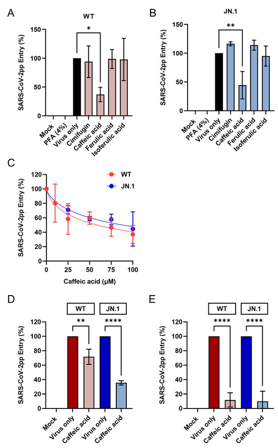 To identify the antiviral mechanism of Cimicifuga foetida rhizome water extract, we next investigated its major components, including isoferulic acid, ferulic acid, caffeic acid, and cimifugin [23,37,38]. The cytotoxicity profiles of the compounds were first determined (Table 4), and 100 μM (a non-cytotoxic concentration) was used for the entry-inhibition assay. The results indicated that, out of the four candidates, only caffeic acid blocked both WT and JN.1 SARS-CoV-2pp entry at 100 μM (Figure 5A,B) and demonstrated dose-dependent inhibition (Figure 5C). The estimated EC50’s were 58.62 μM and 88.32 μM for the WT and JN.1 strains, respectively. Additionally, caffeic acid was able to inactivate the pseudoparticles directly (Figure 5D) and also inhibit pseudoparticle entry following 24 h pretreatment of host cells (Figure 5E). These findings suggest that the compound exhibits both virucidal activity and the capacity to interact with host-cell factors involved in viral entry.