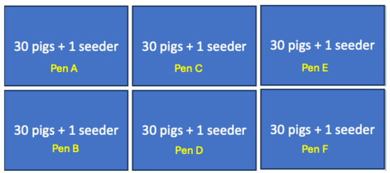 Layout of the study pens consisting of six replicates of 30 pigs and 1 seeder pig per pen. The location of the different pens (Pen A–F) is shown.